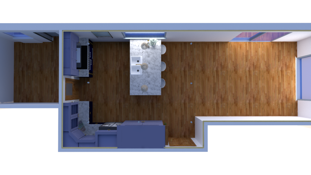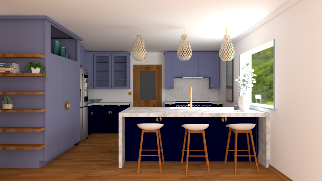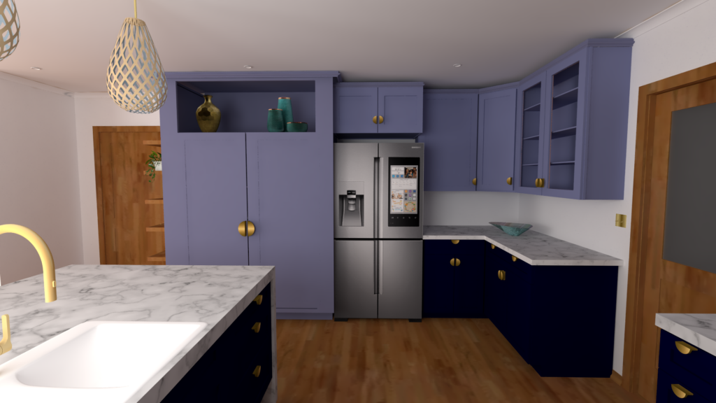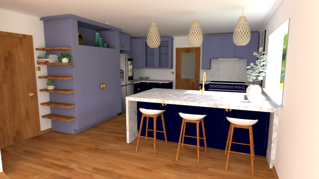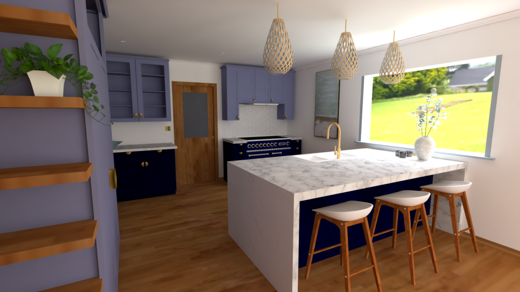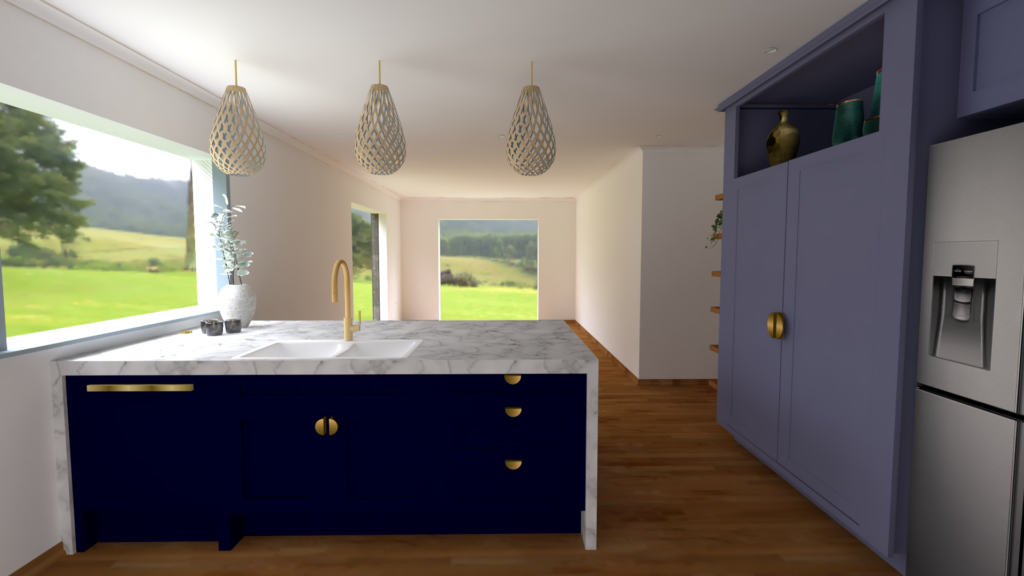A digital render of a new client’s vibrant kitchen space. We chose bespoke cabinetry in a fun colour, drawing upon a traditional English style with a modern twist, making use of the long space for kitchen and dining. The client wanted a space for casual dining at the marble bench top, as well as statement lighting to accentuate the space. Dual tones in the cabinetry add weight, and the warm wood tones used throughout balance the space.